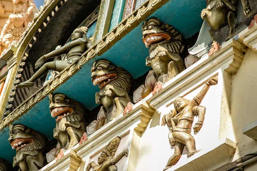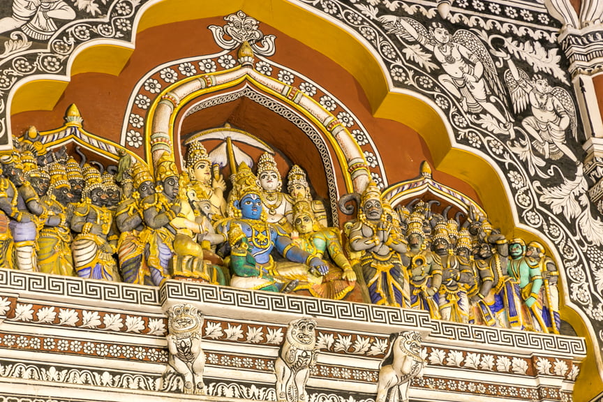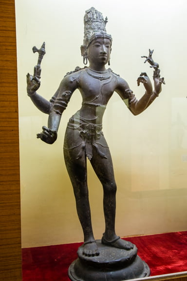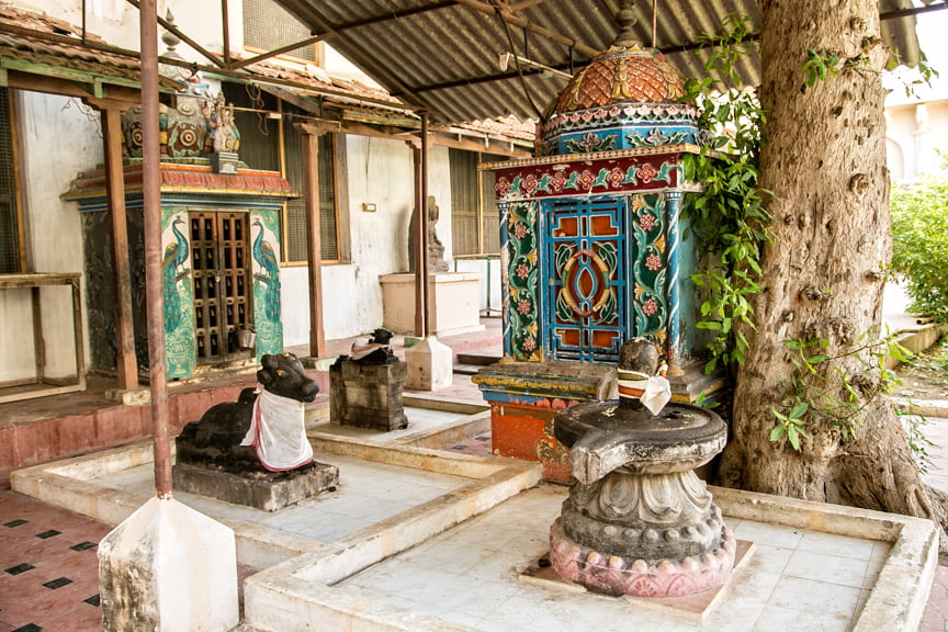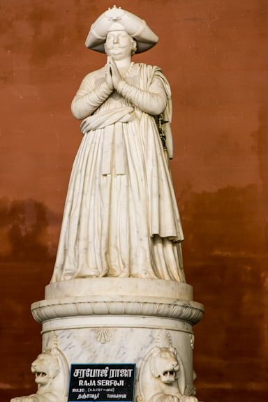 There are two main halls, the Royal Palace Museum filled with valuable statuary, most behind glass, and a statue of Raja Serfoji who lived from 1797-1832. There is also a famous library filled with rare sanskrit manuscripts. Since time was of the essence, we skipped the library. Unfortunately, tourists are not allowed to climb the six-story Madamaligai belltower as it was damaged in a lightning strike.