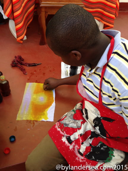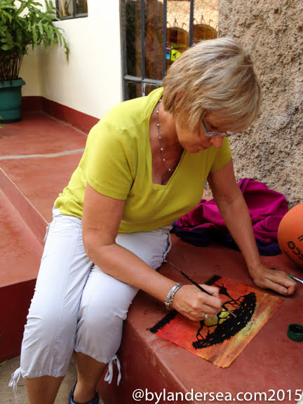I then transfer the drawing to a piece of cloth and trace it onto both sides. After that, I head over to get help with the background color. I decide I want my sky to be a sunrise, so one of the artists covers the sun with wax and then washes on a thin layer of paint that looks like a watercolor sky. The artist helps everyone, and our projects begin to take shape.