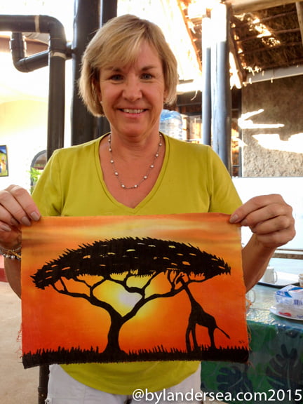 Fortunately, the group of artists promises to assist us, and we all sit at the table and attempt to draw. An acacia tree is within my ability, a round sun I manage, but I want to add a lone giraffe in my picture. Thankfully, one of the artists helps me shape a giraffe head.