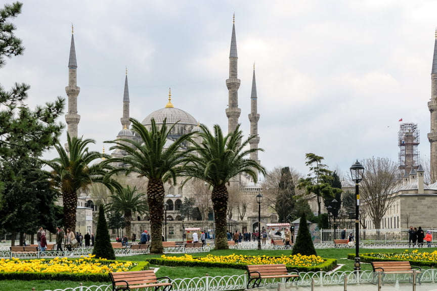 We left the Blue Mosque through a doorway that opens toward a wide plaza filling the space between these UNESCO World Heritage sites. The pedestrian-only park is filled with vibrant flowering gardens, fountains and walkways. Tulips are definitely in bloom.