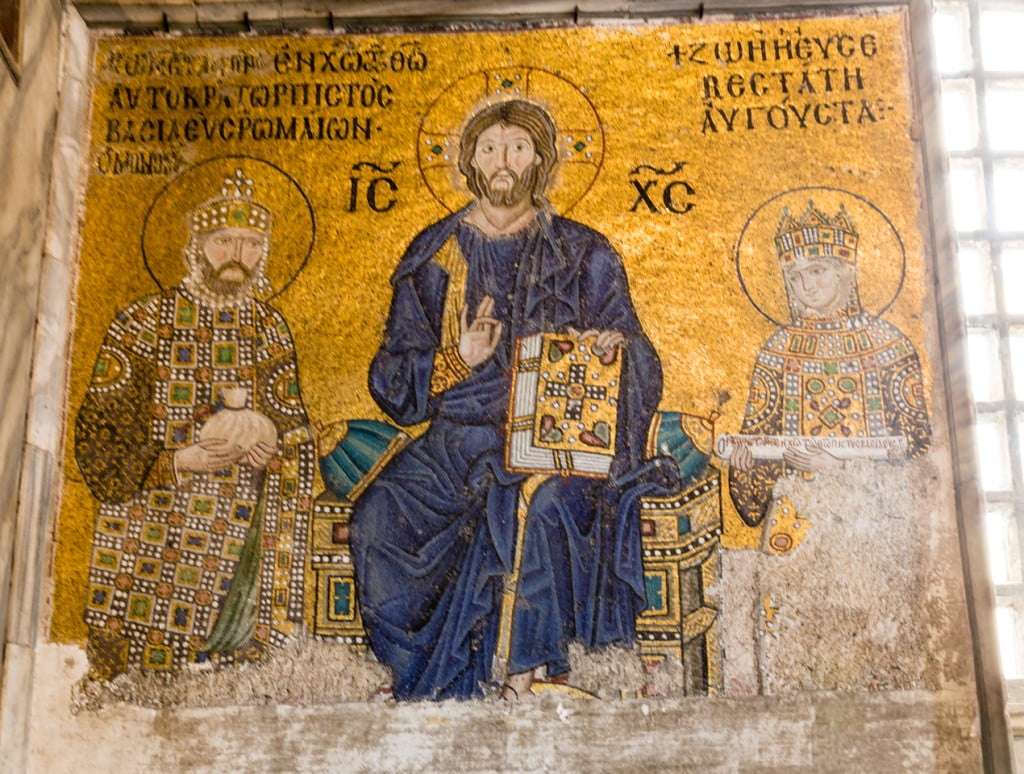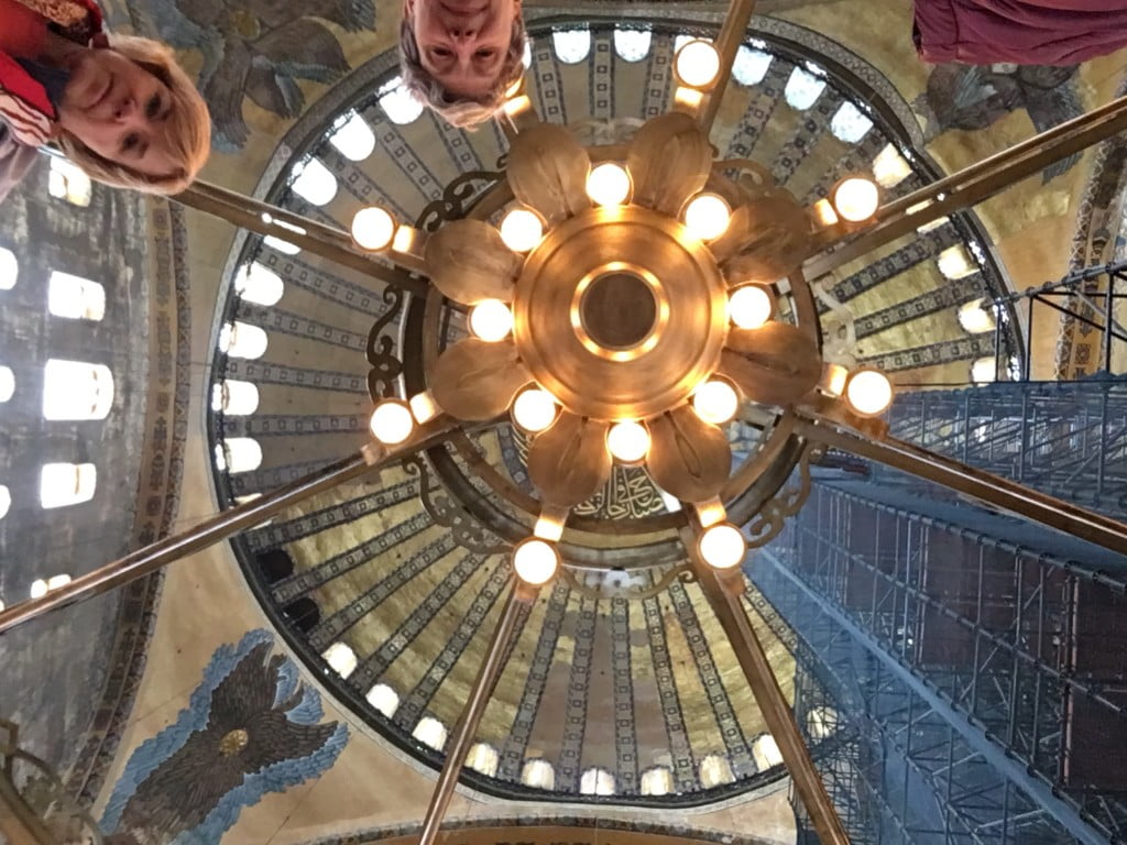 The center dome is the fourth largest in the world (following the Vatican, St. Paul’s in London, and Florence’s Duomo.) It is, of course, the oldest, completed in 532 AD. The dome’s diameter measures 107 feet and appears to hang in midair without support. There wasn’t another monument of this size constructed for another 1,000 years, an awe-inspiring reminder of the knowledge acquired by the Byzantines. Our guide showed us how one side is now off-center, but you would never know just looking at it. Despite the earthquakes that hit Istanbul from time to time, Hagia Sofia remains intact although it has undergone many restorations. Today, scaffolding covers one side of the interior.