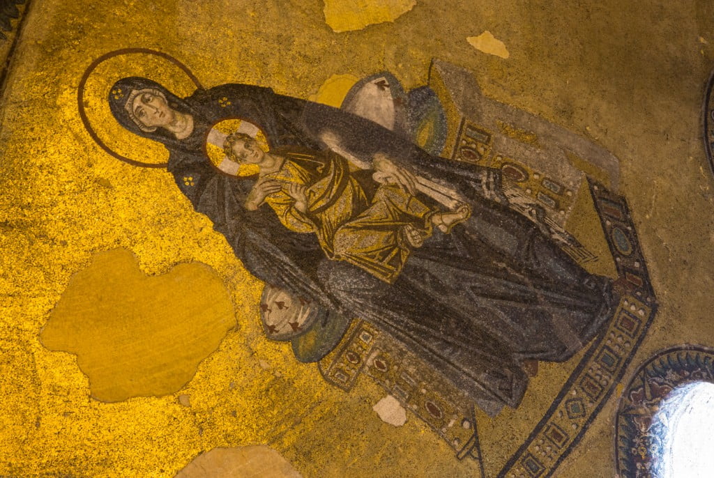 We climbed to the second-floor galleries via a series of inclined rocky ramps. Here you can view the intricate golden mosaics from the church’s earliest period, those that were previously covered by plaster when the structure was converted into a mosque. However, the figure of the Madonna and child, just below the central dome always remained visible – only the eyes were concealed.