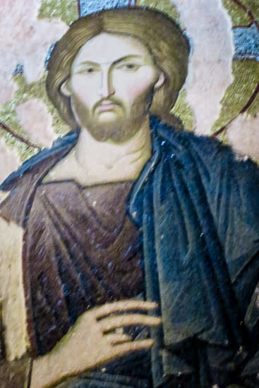 Constantine I built the monastery church outside the city walls in the 4th century. It was damaged by a strong earthquake in 558 AD and afterward restored by Emperor Justinian. By the 10th century, the church was near ruin. Maria Dukania, a devout Christian, financed the present building, a dome on four pillars (which we couldn’t see). Later several other buildings were added. The church remained safely in the hands of Orthodox monks during the Crusades. Theodores Methochides devoted his entire fortune to a needed restoration in 1305-1320. The exquisite mosaics and frescoes, including those in the funeral chapel, date from that period.