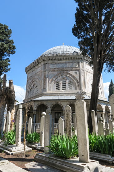 We then meandered past the University to our desired destination, the massive Suleymaniye Mosque and Complex built between 1550-1557. Like other mosques of the time, the buildings surrounding the center for prayer included a soup kitchen, mental hospital, baths, a school and shops. The mausoleums rest in an octagonal domed building. The mihrab is made from white marble and includes stained glass from the 16th century.
