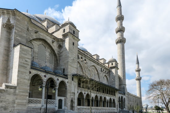 The renowned mosque is considered one of the finest examples of Islamic architecture. It contains four minarets, two of them have two galleries or serefes, and the other two have three, making a total of ten serefes. This was to symbolize the fact that Suleyman I, or Suleyman the Magnificent, was the tenth sultan in the Ottoman dynasty. These towering spires give it a distinct identity to the skyline of Istanbul.