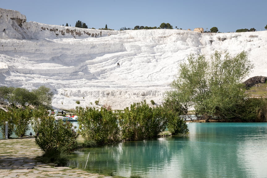 Like all tourist havens, Pamukkale attracts busload after busload of tourists by day, but becomes much less crowded by late afternoon. Visitors can swim in a spa pool with thermal waters and fragments of columns, but it is costly. Others take boat rides in the lake below.