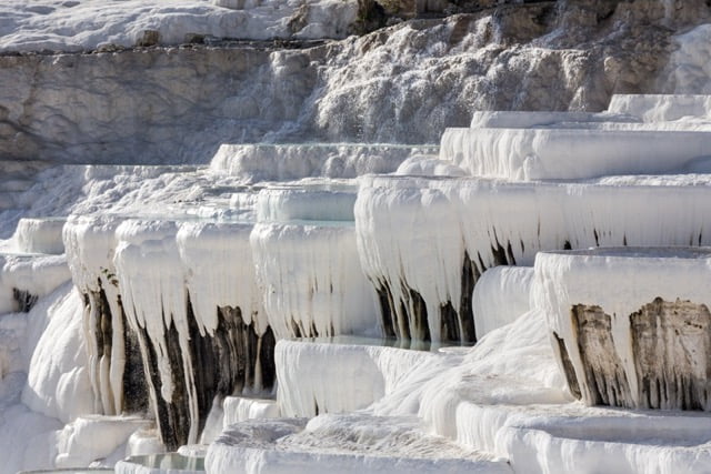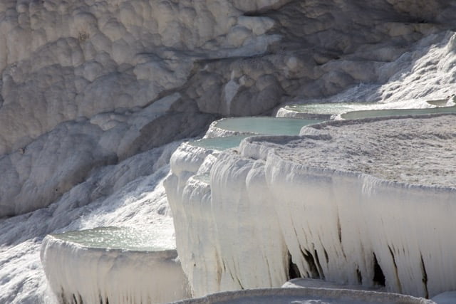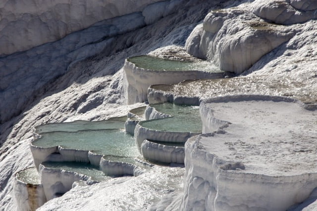Pamukkale’s gleaming white calcite shelves overrun with warm, mineral-rich waters to form the so-called ‘Cotton Castle’ (Pamuk means ‘cotton’ in Turkish). The solution of calcium carbonate in the spring water decomposes into carbon dioxide, calcium carbonate, and water. The carbon dioxide is released into the air while the calcium carbonate separates off from the water to form grayish-white limestone sediment.
