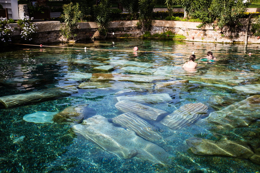After a lunch break, we took off for Pamukkale known for the mineral-rich thermal waters that flow down white travertine terraces on a hillside. I hadn’t expected Pamukkale to abut Hierapolis; an ancient Roman spa city founded around 190 B.C. The joint site of Hierapolis-Pamukkale was made a World Heritage Site in 1988.