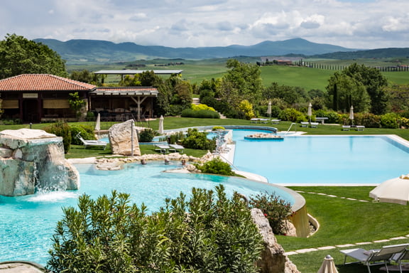 In 2016, while in Italy, I luxuriated for two days at the posh ADLER Thermae Spa & Resort. This Tuscan haven is near Bagno Vignoni, the ancient complex of naturally fed thermal baths and pools. At the Adler I scooted among warm water-jets strategically placed around the swimming pool, relieving my aching, travel-weary muscles. In the center, a powerful pulsating fountain pounded at my tightened back, head and entire body simultaneously. Crawling out after a few rounds of this pleasurable assault, a real pro applied an “aah”-producing massage. The Adler Resort, the ultimate in relaxation, even lets you wear your spa robe to breakfast and lunch.
