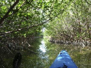 A little later in the morning, I drove a few miles to the kayak rental shop at Robbie’s Mariana. I was expecting to be expected, as travel writers frequently are, but I wasn’t. Nonetheless, I arranged for a kayak and went in search of a crocodile, one I was told would make a great photo. Alas, he wasn’t there. Now I admit, I don’t have the best sense of direction, and the map handed me looked somewhat like a drawing of my first-grade grandson, but it led me astray. Perhaps my car’s GPS has spoiled me—I needed a voice to tell me, turn here—NOW. I was lost in the lush mangroves.