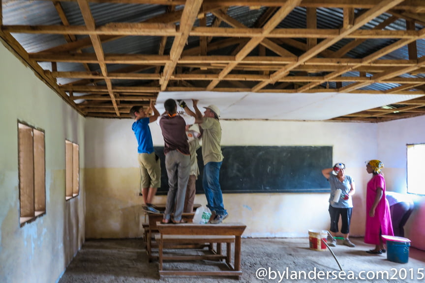 Progress was slow and stressful, needless to say, the building was not exactly level and our tools were not the best. Fortunately, a local construction worker appeared. The ceiling job would never have been finished without his staple gun speedy skills.