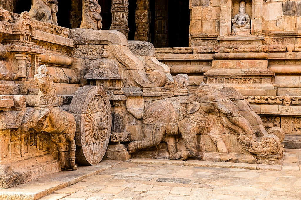 The shrine takes the shape a chariot with large stone wheels that are pulled by an elephant and horse. The temple starts with a mahadwara, or main entrance on the eastern side. Inside this are 108 pillars, each with exquisite sculptures depicting a historical event or a dancing moment. There is also an entire sequence of yoga positions.