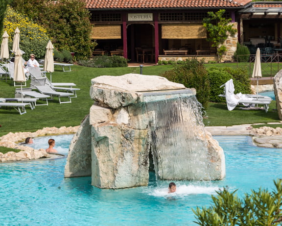 In 2016, while in Italy, I luxuriated for two days at the posh ADLER Thermae Spa & Resort. This Tuscan haven is near Bagno Vignoni, the ancient complex of naturally fed thermal baths and pools. At the Adler I scooted among warm water-jets strategically placed around the swimming pool, relieving my aching, travel-weary muscles. In the center, a powerful pulsating fountain pounded at my tightened back, head and entire body simultaneously. Crawling out after a few rounds of this pleasurable assault, a real pro applied an “aah”-producing massage. The Adler Resort, the ultimate in relaxation, even lets you wear your spa robe to breakfast and lunch.