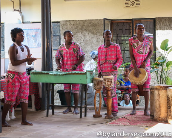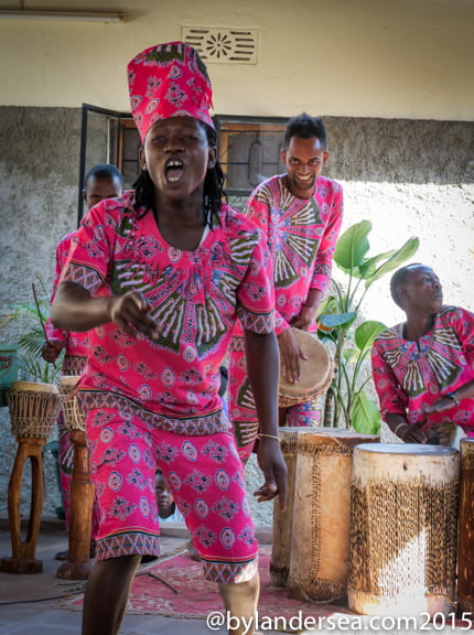 The award winning Kilimajaro Wizards Arts Group sets up drums and a marimba. The men wear striking neon pink outfits and hats. The two females dancers wear white tops and the pink floral shorts. Like birds, I think, the males are more colorful than the females.